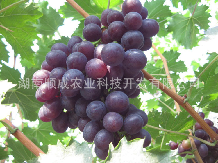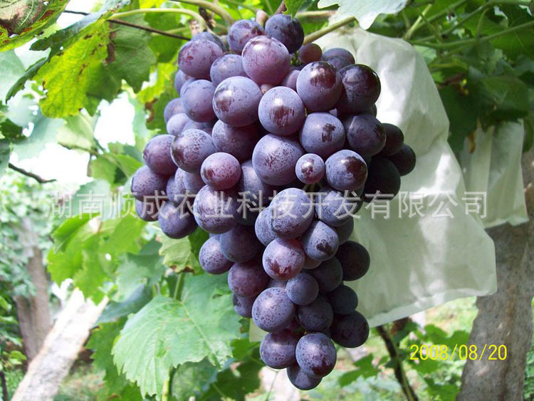 玫瑰葡萄:新育成的歐美雜交種,果穗大,平均穗重675克,大穗重1250克,果粒大,平均粒重11克,大粒重17克,果皮紫紅色,著色好,甜、脆、多汁,口感好。具有濃郁的玫瑰香味,香氣怡人,可溶性固形物含量達(dá)19%~25%。果實(shí)硬度大,耐貯運(yùn),不落花,不落果,不裂果,穗型整齊,無大小粒現(xiàn)象。一般種后第2年結(jié)果,株產(chǎn)達(dá)4~5公斤,3年達(dá)入豐產(chǎn)期。耐高溫多濕,性強(qiáng),易栽培,好管理。株行距1.5米×2.2米,每畝栽200株。